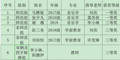 本赛事是广西区唯一一个由教育厅主办的专业钢琴比赛,代表了广西高校钢琴专业的最高水平。比赛历经数天角逐,我校教育与音乐学院师生团队发扬团结协作、积极奋进的精神,最终7名师生自数千名参赛者中脱颖而出,获师范组一等奖2项、三等奖1项,非专业组三等奖2项,双钢与四手联弹组三等奖1项,取得了该项赛事我校首次参赛的开门红。