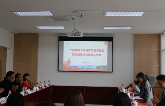 11月30日下午,广西高校学生会(研究生会)深化改革评估工作组第六组到我校开展学生会(研究生会)深化改革评估验收工作。校党委副书记、纪委书记、副校长邓志平,学生事务部部长蒋远宏,学生事务部副部长、校团委书记王瑞及校团委全体团干,各二级学院团总支书记、学生会代表和普通学生代表参加本次评估工作会。