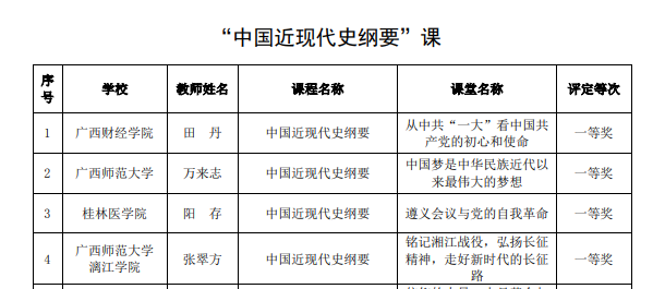 近日,自治区党委教育工委公布了《自治区党委教育工委 自治区教育厅关于公布2020年全区高校学习习近平新时代中国特色社会主义思想示范课堂获奖结果通知》(桂教工委宣〔2020〕23号),我校推送的作品荣获一个一等奖、两个三等奖的好成绩。