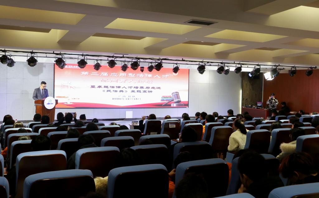 12月18日,我校在至善讲堂举行了第二届应用型法律人才协同育人论坛暨卓越法律人才培养与走进《民法典》主题宣讲活动。论坛邀请了法治日报社广西记者站站长和记者、广西通诚律师事务所领导、广西广合律师事务所领导、广西德恩律师事务所领导、广西祥泰律师事务所领导、广西万然律师事务所领导及法律界专家人士出席并做主题发言。校领导邓志平、杨庆庆,相关部门负责人、商贸与法律学院全体教师及学生代表、广西君健律师事务所律师及实习生代表近200人参加本次活动。