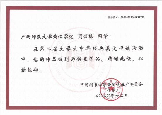 据悉,本次诵读活动全国各高校共推选出362件作品进入专家网络研议阶段,最终专家评选出80件优秀作品晋级现场总评环节,在我校图书馆选送的三个作品中有两个作品获奖,取得佳绩。