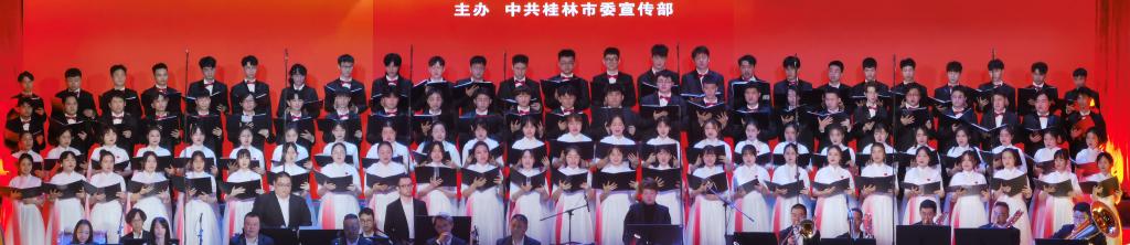 5月15日,我校教育与音乐学院100名音乐学专业学生组成的合唱团为著名歌唱家郁钧剑从艺50周年回乡音乐会伴唱助演,获得主办方和现场观众高度赞誉。此次演出由中共桂林市委宣传部主办、桂林市文学艺术界联合会、中国东盟艺术学院等协办,阵容强大,众星云集。著名主持人杨澜担任主持,夏小汤担任指挥,姜丽娜担任音乐总监,蒋赛担任钢琴伴奏,广西交响乐团、桂林爱乐弦乐组担任伴奏,张也、吕继宏、刘和刚等20余名著名歌手现场助阵演出。