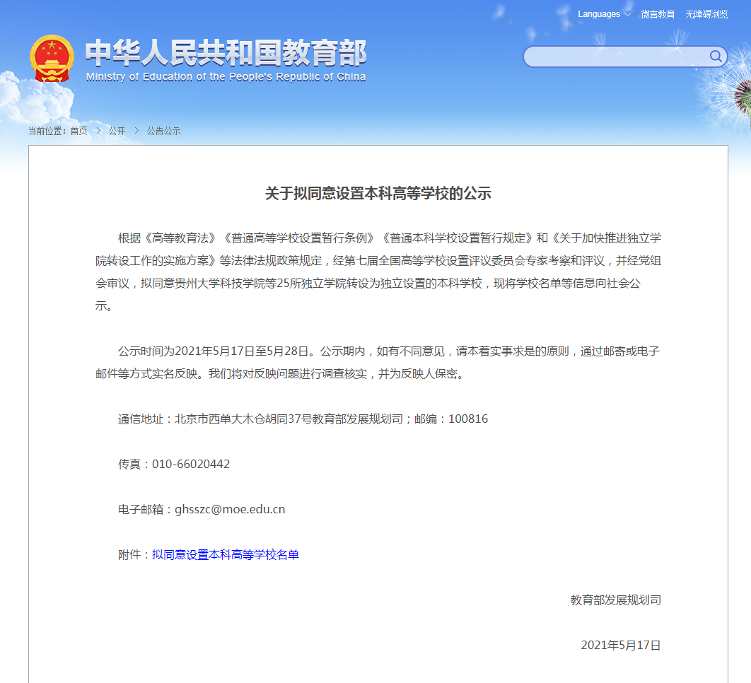 公告指出,根据《高等教育法》《普通高等学校设置暂行条例》《普通本科学校设置暂行规定》和《关于加快推进独立学院转设工作的实施方案》等法律法规政策规定,经第七届全国高等学校设置评议委员会专家考察和评议,并经党组会审议,拟同意贵州大学科技学院等25所独立学院转设为独立设置的本科学校,并于5月17日至5月28日将学校名单等信息向社会公示。