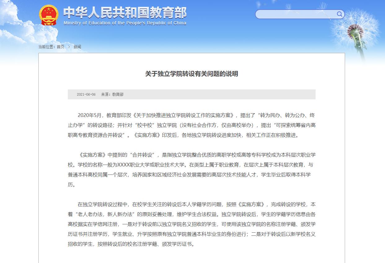 6月6日,教育部官网发布《关于独立学院转设有关问题的说明》