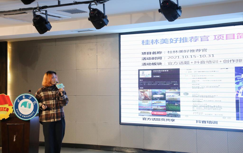 10月21日下午,由广西壮族自治区文化和旅游厅、共青团广西壮族自治区委员会、共青团桂林市委员会、桂林旅游发展总公司、桂林旅游股份有限公司共同发起的“桂林美好推荐官”话题活动在我校至善讲堂进行线下推广,我校团委承办了此次抖音校园分享会活动。校党委书记唐文红出席并致辞,共青团广西区委四级调研员韦成媛,广西学联驻会执行主席雷婷、颜奕桐,共青团桂林市委学校部负责人唐嘉彤及抖音广西区域相关负责人、我校相关职能部门负责人、各二级学院团总支书记、学生代表参加活动。