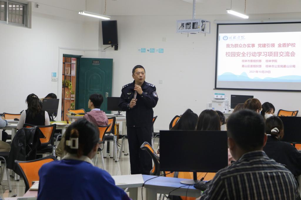 为加强学校安全稳定工作,推进党史学习教育“我为群众办实事”实践活动落实见效,切实发挥师生在校园安全管理方面的主体意识,创新学校安全管理措施,进一步提高学校安全管理水平。10月29日上午,我校联合桂林市委组织部、雁山区委组织部、桂林市公安局雁山公安分局开展“我为群众办实事 党建引领 金盾护校”校园安全行动学习项目启动仪式。校党委书记唐文红、副校长刘文革,桂林市委组织部科长陈军斌,雁山区组织部副部长邓翔,雁山区公安分局政委周长辉、雁山派出所所长贺文雄出席活动,学校后勤保卫处、学生事务部、人力资源部主要负责人,各二级学院党总支副书记参加了活动。启动仪式由刘文革副校长主持。