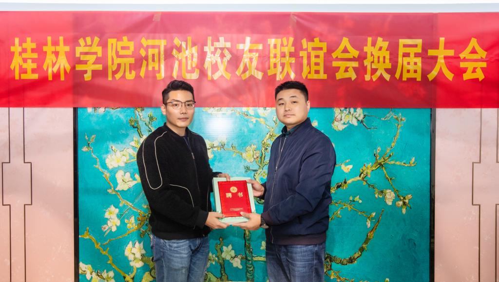 会上,机关党总支书记、后勤保卫处处长李久华,语言文学学院党总支书记江仿,后勤保卫处副处长付健分别向河池校友联谊会新一届理事会成员颁发聘书。会长由韩鑫担任,秘书长由罗懿担任,副会长由张登飞担任。
