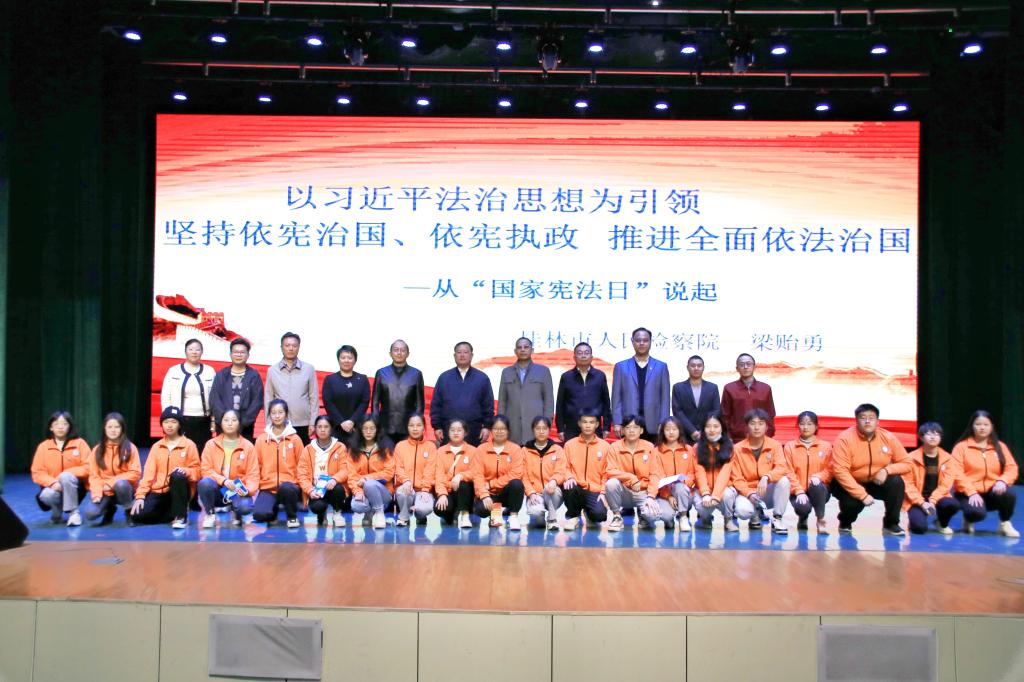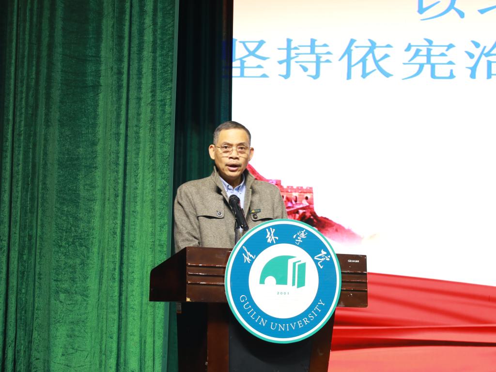 12月6日下午,我校在弘善讲堂举行学习贯彻党的十九届六中全会精神暨宪法宣传教育报告会。桂林市人民检察院党组书记、检察长梁贻勇,桂林市雁山区人民检察院检察长潘险峰,校领导杨树喆、邓志平、杨庆庆以及师生代表共500余人参加报告会。报告会由杨庆庆副校长主持。