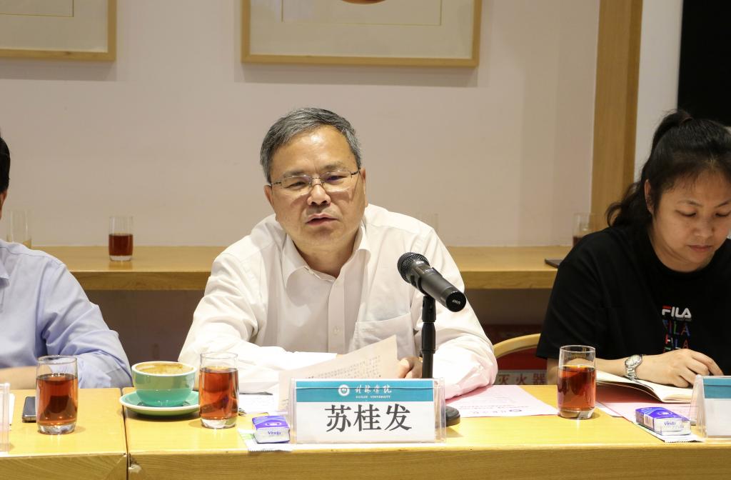 苏桂发在座谈讲话中深情回顾了广西师范大学漓江学院转设过程中的难忘经历,对桂林学院独立设置一年来所取得的成绩给予充分肯定。他表示,在桂林市委市政府的大力支持下,桂林学院过去一年的发展成就有目共睹,这是董事会和全体师生共同奋斗的结果。他强调,今年是桂林学院接受教育部转设高校两年过渡期考核的关键时期,也是广西师范大学建校九十周年,更是党的二十大召开之年,希望两校之间能持续交流跟进、持续互动,相信并祝愿桂林学院的明天会更好!