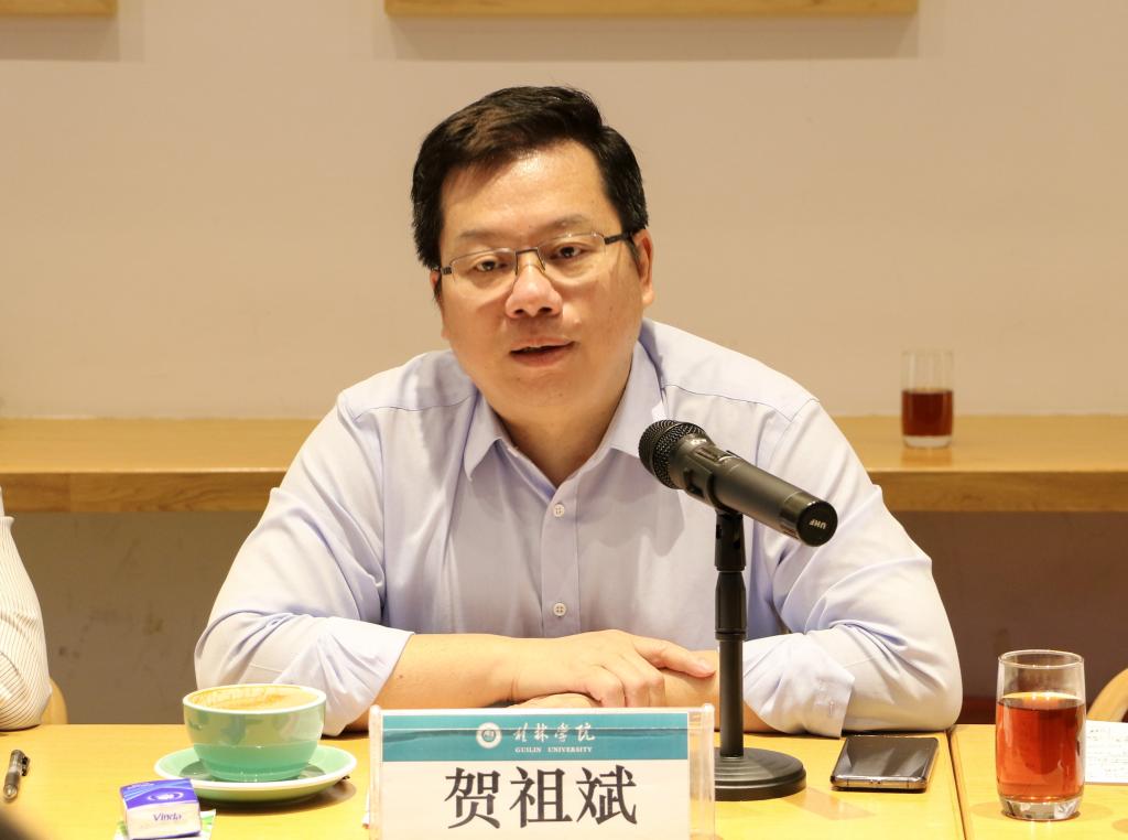 贺祖斌从独立学院转设后面临的机遇与挑战对桂林学院的未来发展建言献策,并祝愿桂林学院越办越好。他指出,独立学院转设后,国家政策的扶持,将会促进民办高校的大力发展;脱离母体学校,经济独立,发展或将提速;独立发展,有助于形成自身的办学特色。但转设后不可避免的会遇到各种困难和问题。他希望,桂林学院在成功转设后,一要重新明确办学定位和人才培养目标;二要打造自己的品牌,提高知名度,树立良好形象;三要以特色专业吸引考生;四要打造一支具有竞争力的教师团队。贺祖斌还对我校请求广西师范大学“对口支援桂林学院”表示大力支持,对所提出的对口支援具体事项分别作了表态。