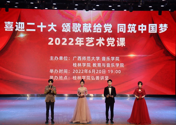 为了迎接党的二十大胜利召开,深入贯彻落实党的十九届中央历次全会精神,6月20日,我校教育与音乐学院联合广西师范大学音乐学院共同举办以“喜迎二十大 颂歌献给党 同筑中国梦”为主题的音乐艺术党课。学校董事长周道林、党组织负责人唐文红因公务未能到达现场,但对此次党课的举办予以热情的关怀和祝贺,给了现场师生很大的鼓舞。广西师范大学音乐学院党委书记周飞、副书记钟景清率部分师生到场参加了本次音乐党课,我校学生事务部、后勤保卫处、商贸与法律学院、经济管理学院相关负责人,教育与音乐学院领导班子成员和部分师生在艺术党课现场观看。