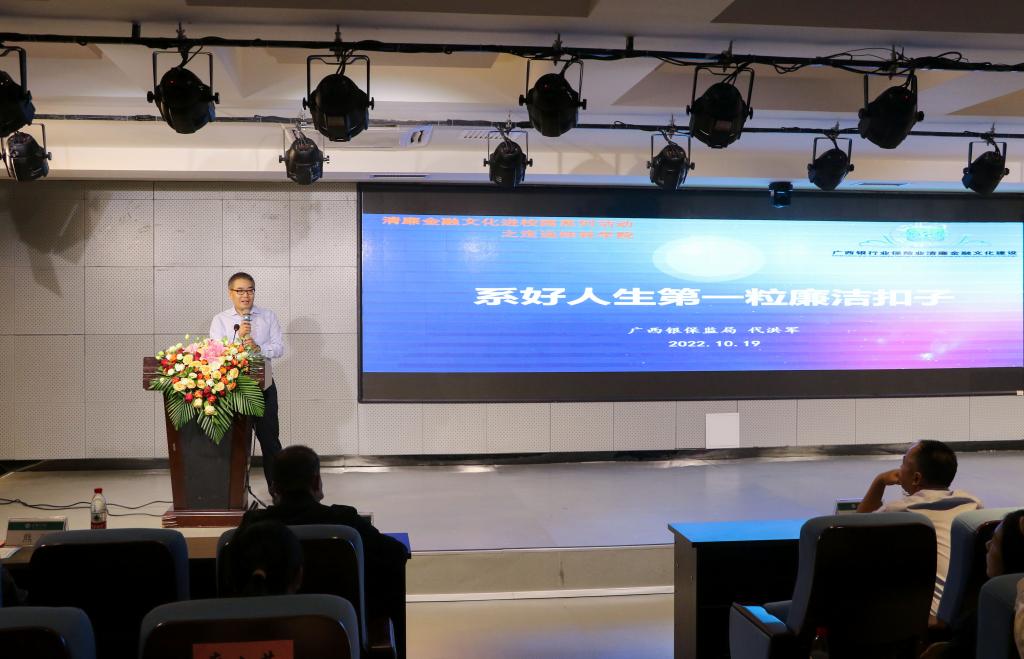 签约仪式后,广西银保监局纪委办公室副主任代洪军同志以“系好人生第一粒廉洁扣子”为题,向桂林学院百名师生代表上了一堂清廉金融文化课。代洪军结合党的二十大精神,从青年清廉微视频切入,结合部分腐败案例,分析当前金融反腐形势,介绍近年银保监会、广西银保监局清廉金融文化建设情况。最后,他向经济与管理学院的学子们提出了几点建议,帮助青年学生树立正确人生观、价值观和财富观,践行廉洁自律要求,在从业前打好廉洁“疫苗”。