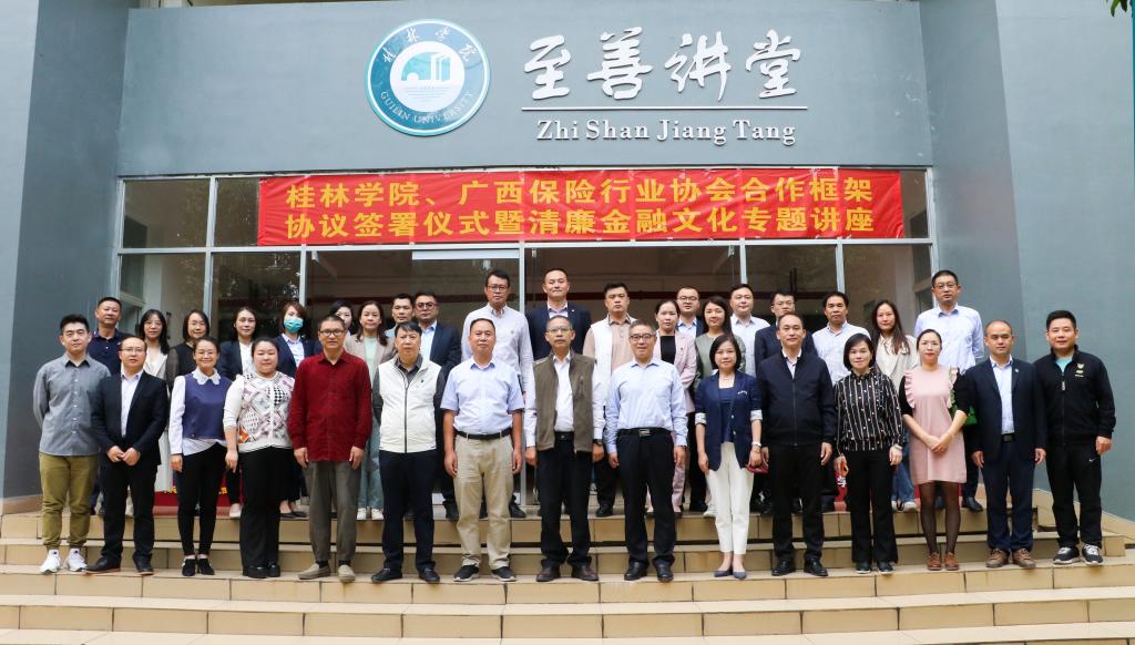10月19日下午,我校与广西保险行业协会举办校企合作签约仪式暨清廉金融文化专题讲座进校园活动。校长杨树喆、副校长祝芸芸,广西银保监局纪委办公室副主任代洪军、广西保险行业协会专职副会长蒋光湘,桂林银保监局分局纪委书记龙宪泓、桂林保险行业协会相关领导、桂林市部分保险公司代表,我校经济与管理学院、教学科研处相关负责人及师生代表共140余人参加此次活动。