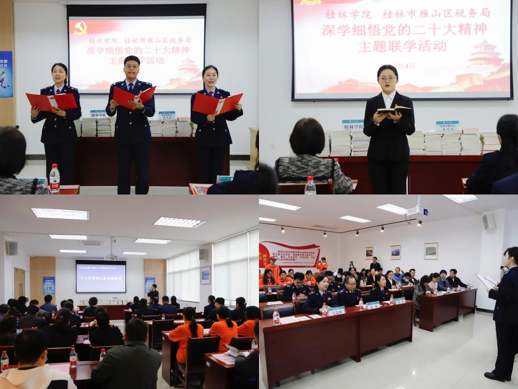 4月,是第32个全国税收宣传月。6日上午,学校与桂林市雁山区税务局在学校图书馆报告厅联合举办“学思践行二十大,校税共建助力税法宣传”活动,活动由管理工程学院、财务处、图文信息中心共同承办。学校副校长祝芸芸,雁山区税务局局长李卉、副局长王军、副局长王志萍等出席活动,管理工程学院、财务处、图文信息中心师生代表,雁山区税务局代表共同参加了活动。