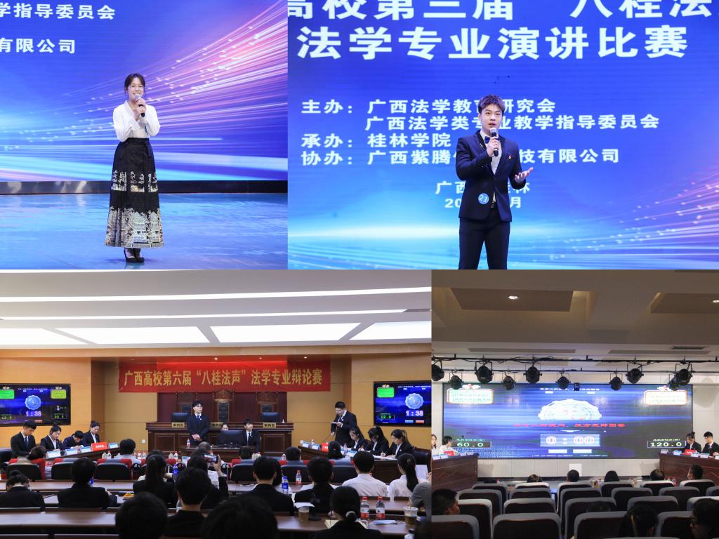 随后,广西高校第六届“八桂法声”法学专业辩论赛、广西高校第三届“八桂法声”法学专业演讲比赛同时举行。来自全区11所高校的近百名优秀法学学子英姿勃发,闪亮登场。在承办方桂林学院的精心准备下,各项赛事紧张有序地开展。辩论赛共有12支队伍参赛,演讲赛有22名选手参赛,本届法律文书写作比赛此前共有21支队伍参赛。经过半天激烈的角逐,广西民族大学辩论队、广西民族大学相思湖学院辩论队在12支队伍中脱颖而出,荣获辩论赛一等奖;梧州学院李佳同学和广西民族大学蒋彤同学力克群雄,勇夺演讲比赛一等奖桂冠;广西师范大学陈静同学和广西大学张艺耀同学表现突出,喜获法律文书写作技能比赛一等奖。出席会议的领导分别为获奖单位及选手颁奖。