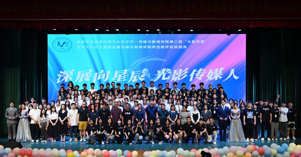 本次展演在传媒与新闻学院团总支学生会活力四射的开场舞《Dare to live》中拉开帷幕,现场掌声阵阵。展演活动围绕“光·破晓”、“影·映像”、“人·传媒”三个环节进行。晚会内容丰富多彩,传媒学子在绚丽的舞台上用专业和自信充分展示了朝气蓬勃、积极向上的精神风貌。其中,由校大学生艺术团主持朗诵队带来的朗诵《在中国大地上报道》,铿锵有力,让现场观众身临其境的感受来自传媒工作者坚定的理想信念;配音秀《这盛世如你所愿》《缘》,让人感受到来自声音的变幻和美感;朗诵作品《不朽》曾获第四届广西高校图书馆朗诵大赛一等奖;理论宣讲《唱响中国之声,谱写青春之歌》将播音与主持艺术专业特色与红色文化紧密结合,奏响了课程思政的和谐音符。舞蹈《Tail》、走秀《时光》、歌曲演唱《是妈妈是女儿》、吉他弹唱歌曲串烧等一度将晚会推向高潮,展现了传媒与新闻学院学子的多彩青春。桂林地方戏曲《十二月花》、敦煌舞《飞天》等让观众感受到了传统文化和地方戏曲的魅力。此外,晚会还展示了新闻学专业、广播电视编导专业在全国大学生广告艺术大赛中的优秀作品。