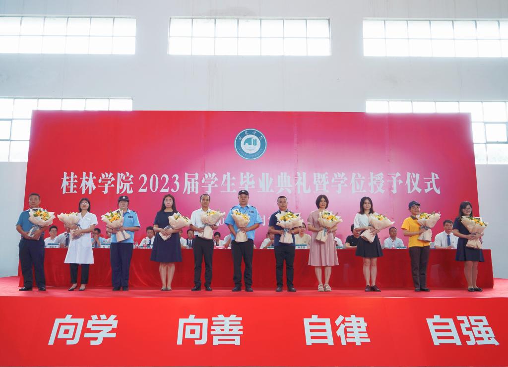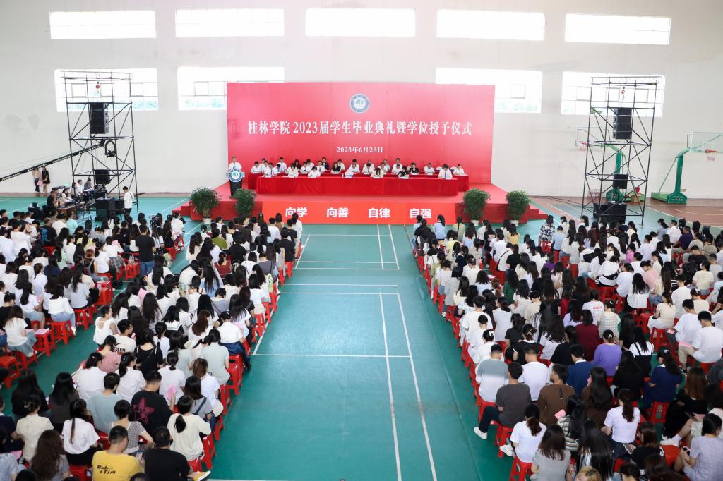6月28日上午,桂林学院2023届学生毕业典礼在彰善楼室内球类馆隆重举行。校董事会董事、校长、党委副书记杨树喆,校董事会董事、党委书记、督导专员唐文红,校监事会监事、党委副书记、纪委书记、副校长邓志平,副校长祝芸芸,校监事会监事、副校长、校工会主席杨庆庆,校董事会董事、副校长何玲,副校长蒋毅,校学位评定委员会全体委员,各职能教辅部门主要负责人,各二级学院院长、党总支书记、副书记、全体毕业班辅导员,毕业生家长代表、教职工代表及非毕业生代表等参加典礼。典礼同步开通了视频、图片现场直播,邀请未能到场参加的毕业生、校友、家长及关心桂林学院办学事业发展的各界人士一同“云端”相聚,共同见证和分享2023届2892名毕业生同学的欢乐与荣耀。毕业典礼由邓志平主持。