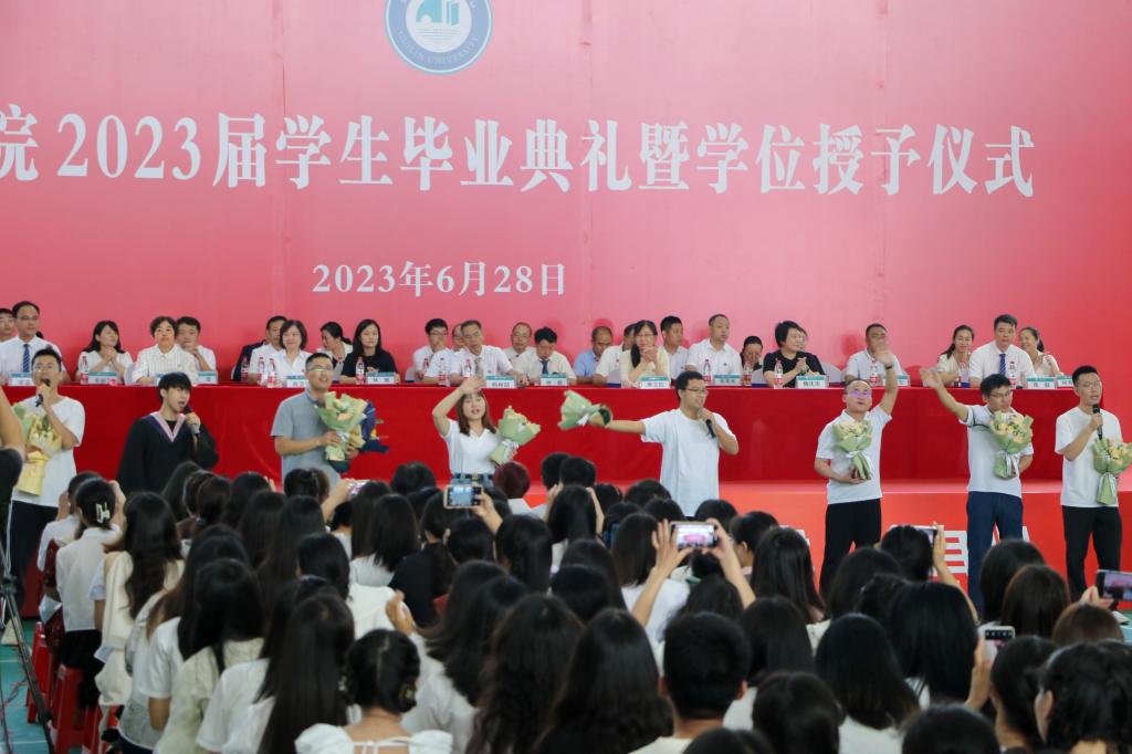 “我怕我没有机会,跟你说一声再见……我会牢牢记住你的脸,我会珍惜你给的思念……”典礼仪式开始前,全体毕业班辅导员们深情献唱的一曲《再见》,唱出了对同学们的依依不舍和真挚祝福,赢得现场阵阵掌声与欢呼。