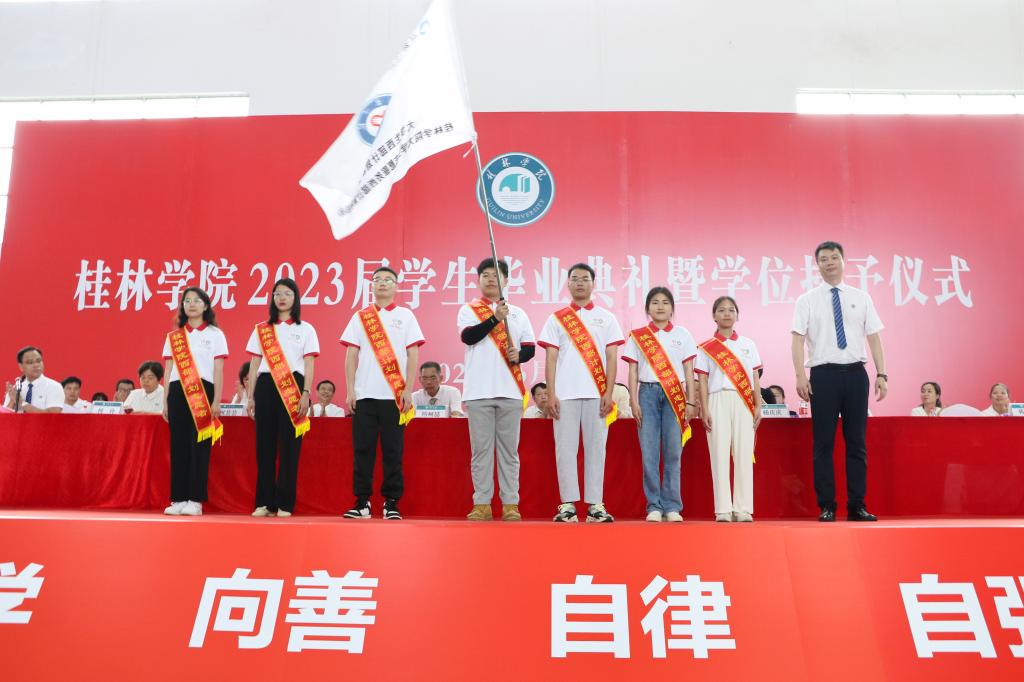 毕业典礼上,唐文红、杨庆庆、何玲分别宣读了学校2023届自治区级优秀毕业生表彰文件、2023届优秀学士学位获得者表彰文件、2023年西部志愿者名单。杨树喆、祝芸芸分别为37名自治区级优秀毕业生和125名优秀学士学位获得者颁发证书,蒋毅为7名西部志愿者代表授旗与佩戴绶带,并合影留念。