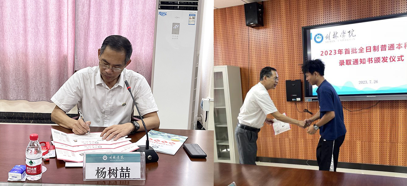 7月26日上午, 桂林学院2023年首批全日制普通本科新生录取通知书颁发仪式在知善楼8312会议室举行。校长杨树喆签发了2023年首批本科生录取通知书。我校2023年录取本科新生、家长代表,学校办公室、教务与产教融合处、发展与质量评估处、学生事务处(部)、招生办公室等相关部门负责人及工作人员参加仪式。录取通知书颁发仪式由副校长何玲主持。