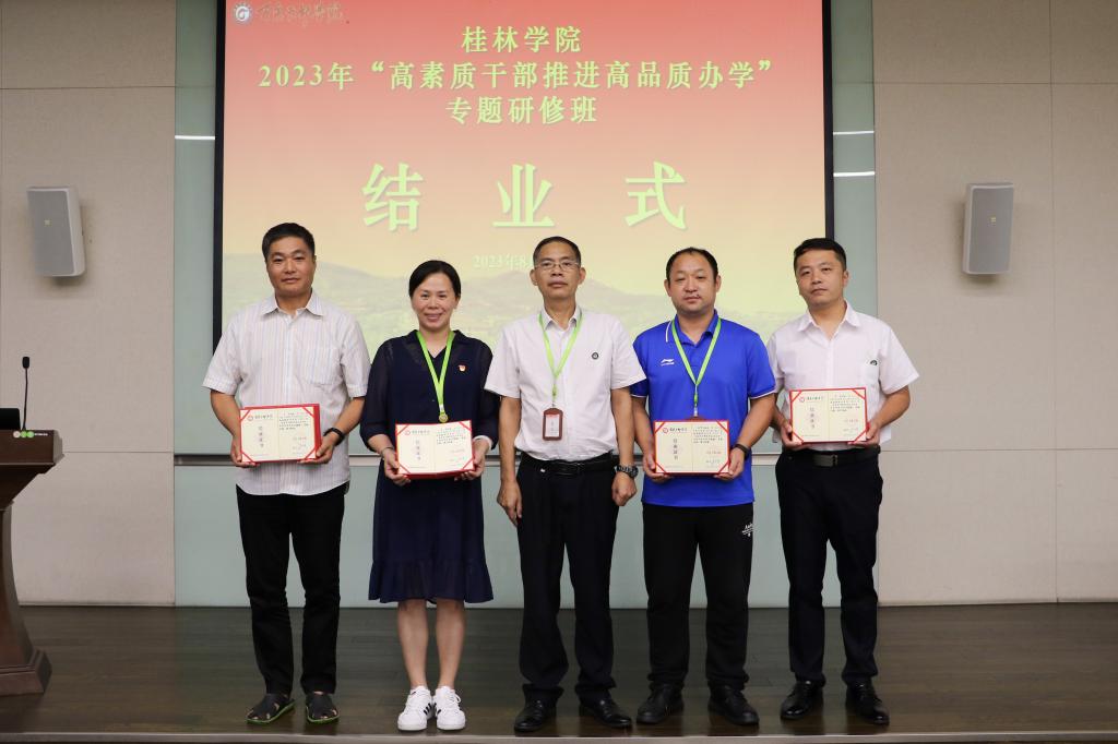 8月25日上午,学校2023年“高素质干部推进高品质办学”专题研修班结业典礼在百色干部学院教学楼209教室举行。百色干部学院组织员蒋莉花,我校领导杨树喆、唐文红、邓志平、祝芸芸、杨庆庆、何玲、蒋毅,研修班全体学员共70多人参加了典礼。典礼由蒋毅主持。