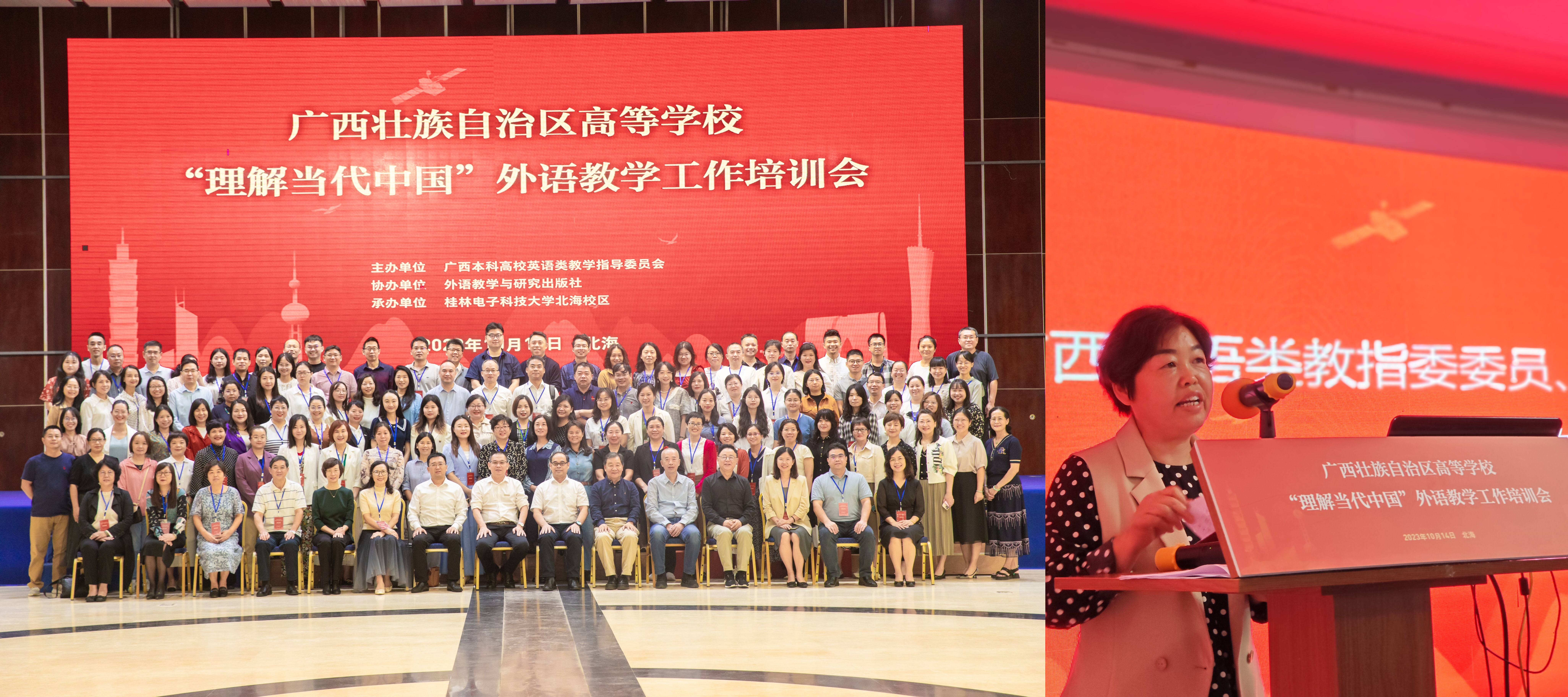 为贯彻落实党的二十大精神,深入推进《习近平谈治国理政》多语种版本进高校进教材进课堂(“三进”)工作走深走实,10月14日,广西壮族自治区高等学校“理解当代中国”外语教学工作培训会在广西北海市顺利召开。本次会议由广西本科高校英语类教学指导委员会主办、桂林电子科技大学北海校区承办、外语教学与研究出版社协办,聚焦《理解当代中国》系列教材使用,研讨课程改革发展,共享教学新方法,共探思政育人新路径。桂林学院副校长何玲教授带队,我校人文学院英语专业教授综合英语、英语演讲、英汉互译课程的一线教师参加了本次培训会。