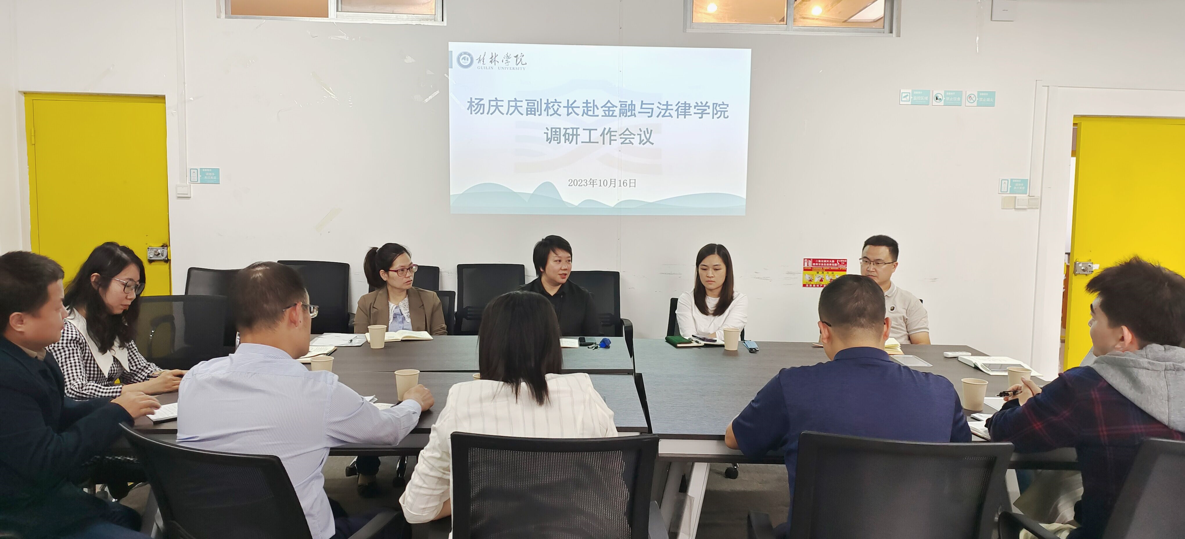 10月16日下午,校党委委员、副校长杨庆庆带队赴金融与法律学院开展调研工作,学校发展与质量评估处、教务与产教融合处相关负责人陪同调研。金融与法律学院领导班子成员、各教研室主任参加会议。