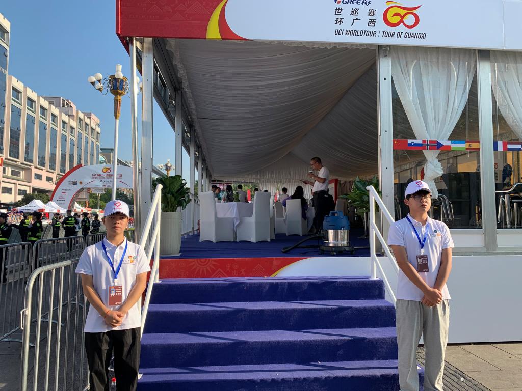 2023年环广西公路自行车世界巡回赛10月17日在“山水甲天下”的桂林收官,在本次赛事(桂林段)中,我校共派出391名学生志愿者助力本次赛事的顺利开展。其中10月15日至18日,102名志愿者前往市区桂林漓江大瀑布饭店、桂林市中心广场、桂林两江国际机场等地协助组委会做好相关会务工作;10月17日,89名志愿者在市区部分点位协助做好安保工作、200名志愿者在雁山段协助做好道路交通管制工作。