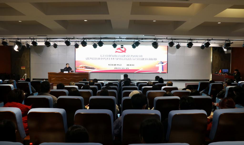 11月15日下午,学校党委书记唐文红在至善讲堂以《以党的政治建设为统领,谱写新时代桂林学院高质量党建新篇章》为题,为师生讲授党课。学校全体在家校领导、全体中层管理干部、全体党支部书记、组织员、师生代表共计130余人到场聆听。