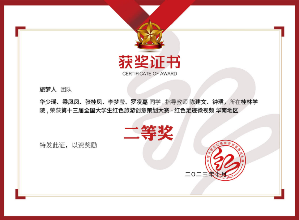 近日,由文化和旅游部资源开发司联合辽宁省文化和旅游厅、丹东市人民政府、北京第二外国语学院共同举办的第十三届全国大学生红色旅游创意大赛现场决赛及颁奖典礼在辽宁省丹东市落下帷幕。经过激烈角逐,由我校钟珺老师、陈建文老师指导的“桂北红星泰红辣”团队荣获全国总决赛二等奖,钟珺、陈建文等两位老师获评“最佳指导教师奖”,取得我校在该项赛事上历年最好成绩。此外,钟珺、陈建文指导的“旅梦人”团队,胡又嘉、程欣指导的“逐梦小队”团队获华南赛区二等奖。