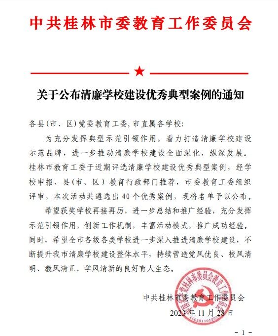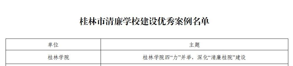 近日,桂林市教育工委公布了全市清廉学校建设优秀典型案例名单,我校以《桂林学院四“力”并举,深化“清廉桂院”建设》为题的案例,入选优秀典型案例。此案例从“增强政治建设‘统领力’,弘扬优良党风”“汇聚校园治理‘向心力’,铸就清明校风”“发挥高尚师德‘感召力’,打造清正教风”“强化学风建设‘正向力’,营造清新学风”等四个方面全方位介绍清廉桂院建设各项工作的举措与成效。 我校将以此次评选为契机,不断学习借鉴、凝练总结清廉学校建设的特色亮点和做法,创新工作机制,提升工作质效,持续深化清廉桂院建设,推动清廉文化的创新和融入学校教育教学,为学校的高质量发展注入“廉动力”。
