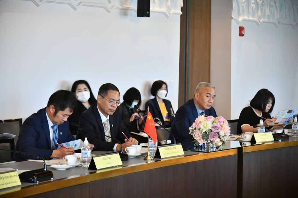 访问泰国上议院教育委员会期间,上议院教育委员会主席端·安塔猜、第一副主席巴里查·波威拉叻、资深顾问邬·波昂奔上将、各大教育机构代表以及十余所职业教育院校校长在新国会大厦上议院二楼202特别接待室共同接待杨树喆一行。双方围绕中泰两国高校教育合作、泰国各教育机构开设国际化课程、外国留学生奖助学金和泰国赴华留学生奖助学金、与私营机构开展合作以促进毕业生就业等内容展开充分讨论。