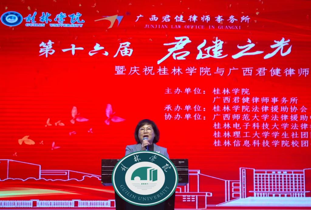 杨庆庆为活动致辞,在回顾与广西君健律师事务所的合作共建历程中,她代表学校对律所为我校法学学科建设、卓越法治人才联合培养提供的大力支持表示由衷感谢,希望今后双方以培养面向本地区基层法律服务人才为共同目标,建立长期战略合作伙伴关系。她指出,校所合作举办第十六届“君健之光”大学生法律知识竞赛,希望广大师生掌握法律常识、提高法律素质,为建设社会主义法治文化贡献力量。广西君健律师事务所主任黄丽娟在致辞中表示,将继续深化与我校在法学专业课程设置、实践教学、学科竞赛、师资共建的合作,共同建立产教融合协同育人的应用型人才培养新模式。