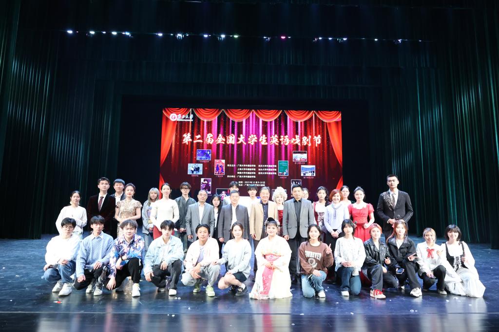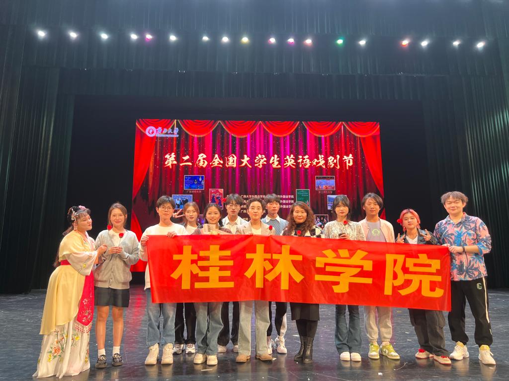 12月9日,第二届全国大学生英语戏剧节决赛于广西大学汇学堂大剧场拉开帷幕,来自全国各地高校的16支队伍齐聚一堂。在激烈角逐中,由我校人文学院通过校级层层海选、精心组织的11人代表队凭借原创剧目To the Deep Blue Sky: A Tribute to Evan Hansen(《致深蓝色天空》)荣获二等奖,指导老师黄彦立、唐茂妮和苟鑫蕊荣获优秀指导教师奖。