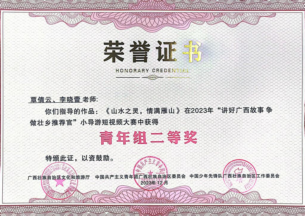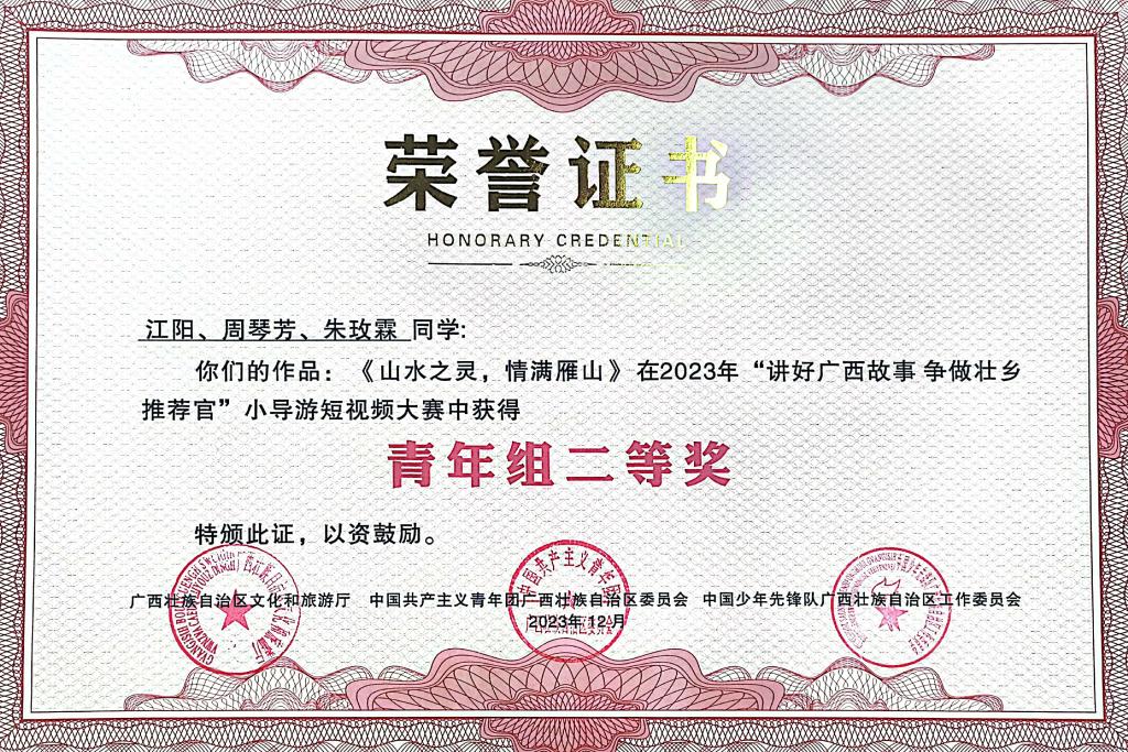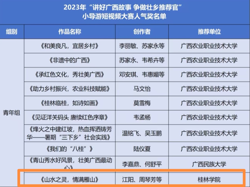 近日,“讲好广西故事 争做壮乡推荐官”小导游短视频大赛正式完结,活动由自治区文化和旅游厅、共青团广西区委、广西少工委主办,广西云数字媒体集团承办。我校学生作品《山水之灵,情满雁山》最终撷获青年组二等奖、最佳人气奖以及入围奖三项自治区级奖项。