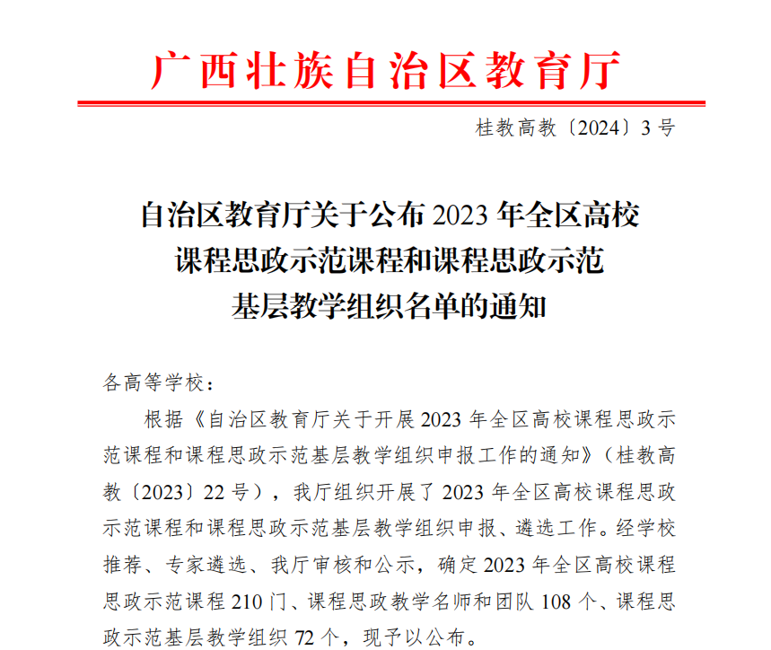 近日,自治区教育厅公布了2023年全区高校课程思政示范课程的名单,我校《幼儿园手工制作》和《中国文化概论》两门课程成功入选,课程团队成员荣获“课程思政教学名师和团队”称号,这为我校课程思政建设工作再添光彩。
