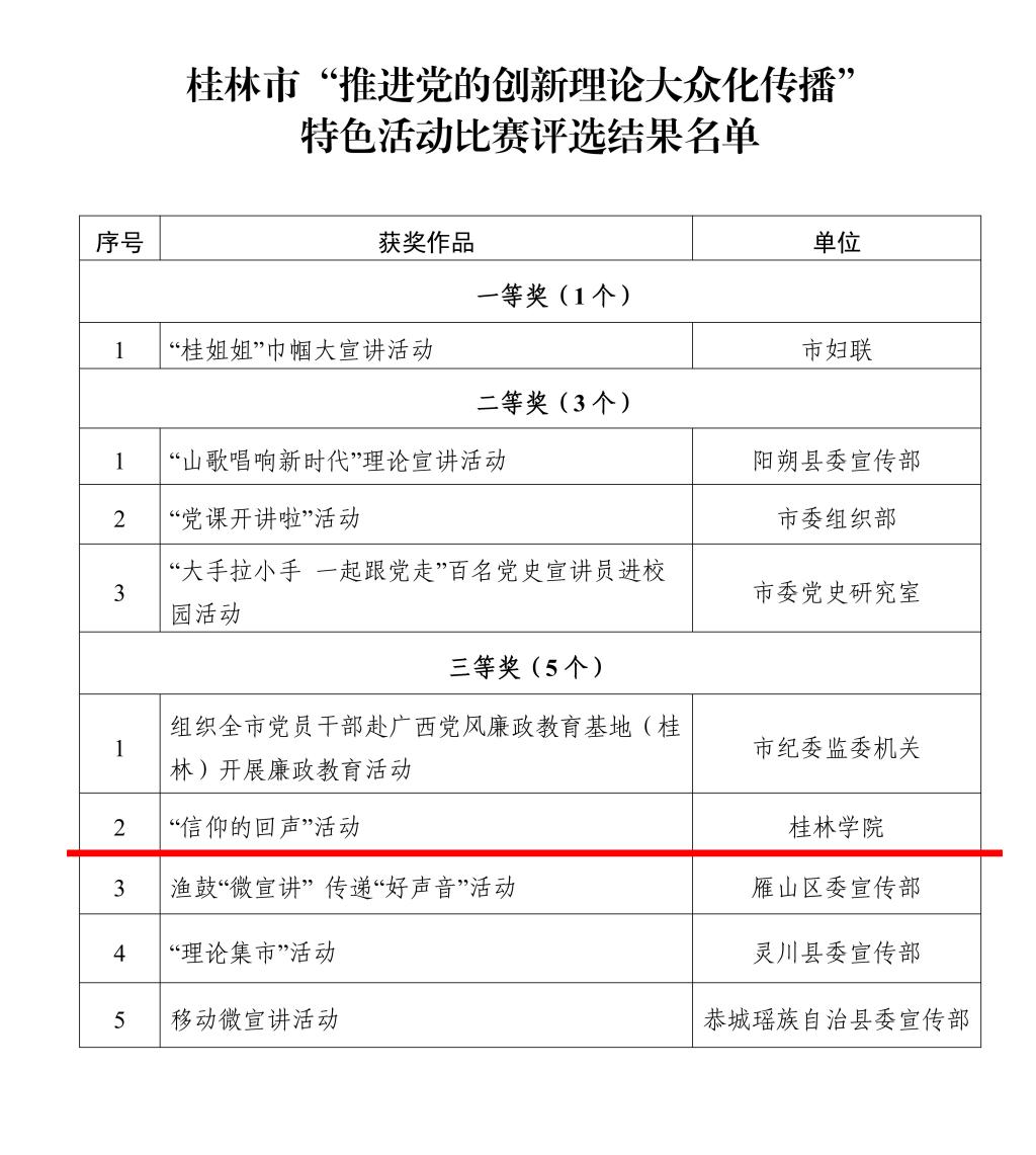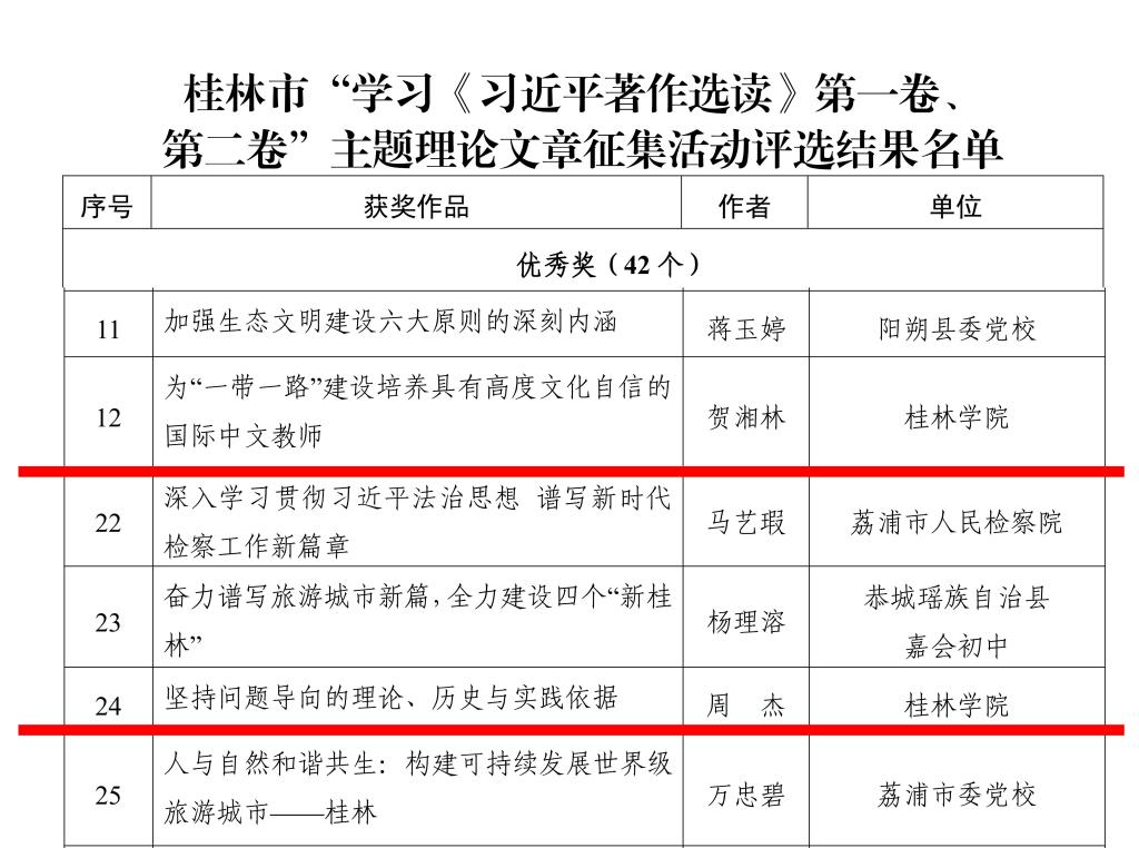 近日,中共桂林市委宣传部公布了2023 年度桂林市推进党的创新理论大众化传播系列活动评选结果,我校传媒与新闻学院活动品牌“信仰的回声”获桂林市“推进党的创新理论大众化传播”特色活动比赛三等奖;人文学院教师贺湘林、教育学院教师周杰获桂林市“学习《习近平著作选读》第一卷、第二卷”主题理论文章征集活动优秀奖。