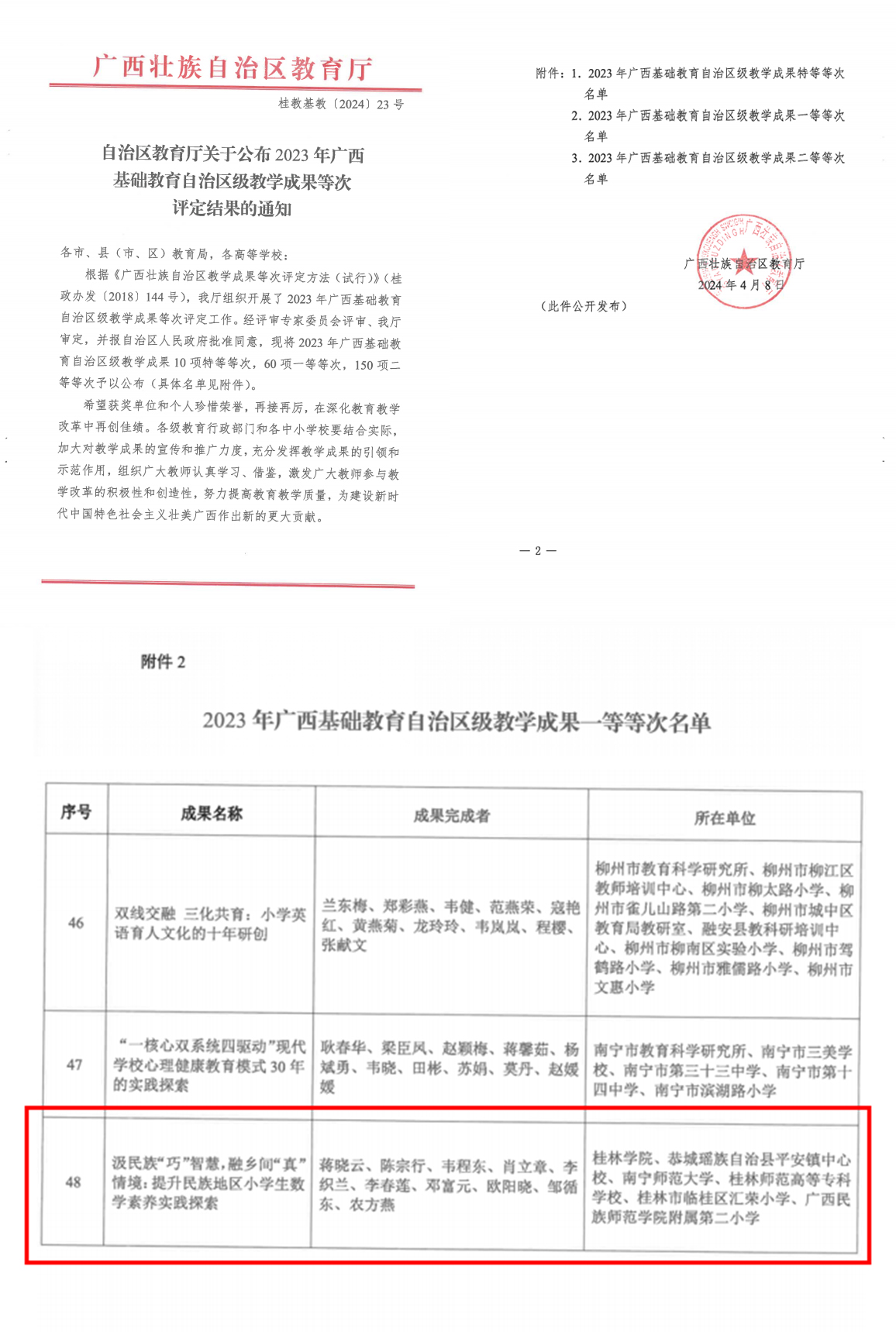 近日,《自治区教育厅关于公布2023年广西基础教育自治区级教学成果等次评定结果的通知》(桂教基教〔2024〕23号)公布了2023年广西基础教育自治区级教学成果等次评定结果,我校蒋晓云教授主持的基础教育教学成果《汲民族“巧”智慧,融乡间“真”情境:提升民族地区小学生数学素养实践探索》荣获一等等次,这是学校“十四五”期间获得的重要标志性成果之一。