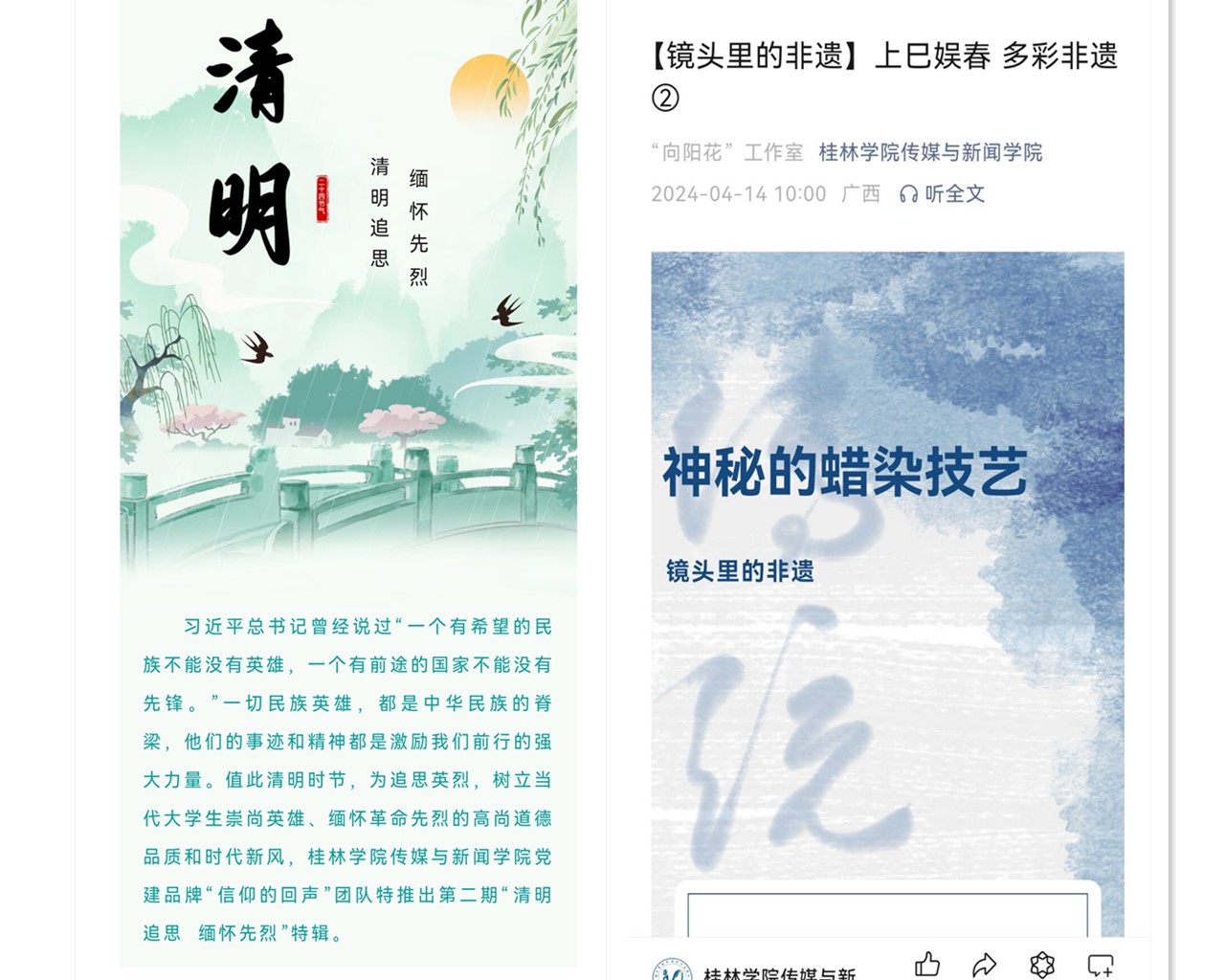 传媒与新闻学院┃注重实践,提“两率”强“专业”。学院依托专业特色开展“信仰的回声”“镜头里的非遗”等专业特色活动;动员并组织师生前往广西师范大学美术馆参观学习“春和景明 上已春嬉”--“广西三月三”民族影像展览,在强化实践教学的基础上,积极探索学风建设的新路径。此外,学院举办书记有约“研师益友”考研复试冲刺分享会、学风建设打卡、班级公约制度评选、最美笔记评选等活动,全力做好学生考研服务工作的同时,促使学生加强自我管理,不断调整自己的学习状态和行为习惯。