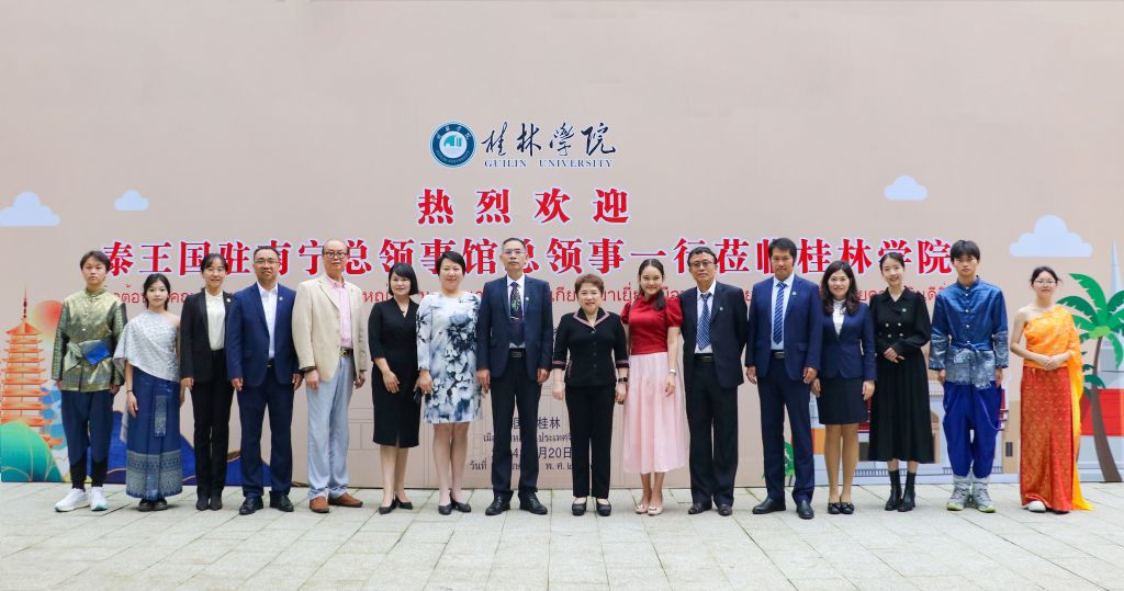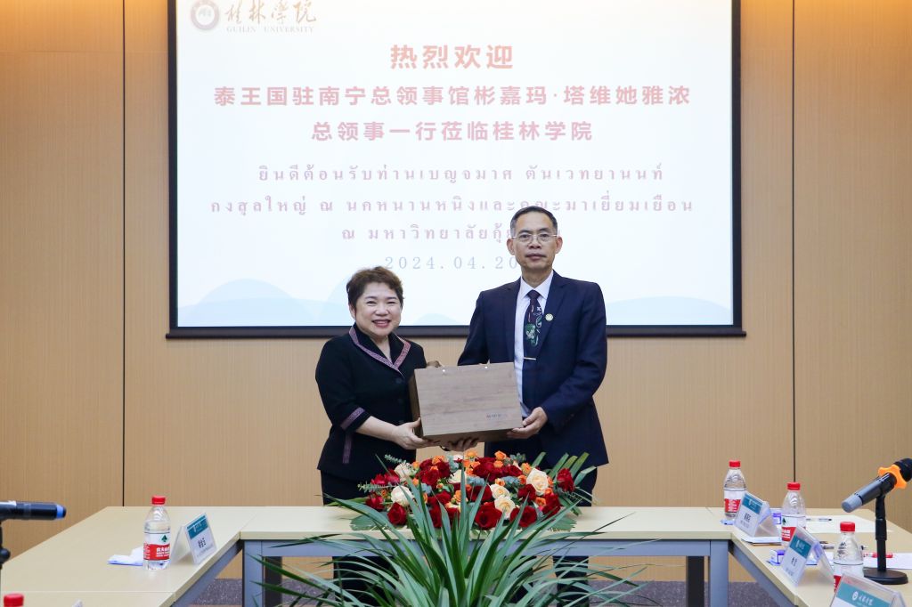 彬嘉玛·塔维她雅浓对学校的热情接待表示感谢,对桂林学院在泰语、汉语国际教育、商务英语等专业合作办学方面的良好合作,以及我校学生积极参加泰王国驻南宁总领事馆举办的广西高校泰语演讲公开赛并取得优异成绩表示赞赏。她表示,泰王国驻南宁总领事馆将致力于持续推进泰中双边的教育文化合作关系,积极开展各类泰中交流活动,进一步加强泰中友好关系。她强调,泰王国驻南宁总领事馆将继续为桂林学院与泰王国高校等的交流合作铺路搭桥,积极促成双边各类高水平的合作项目,共同推动泰中教育强化交流合作高质量发展。