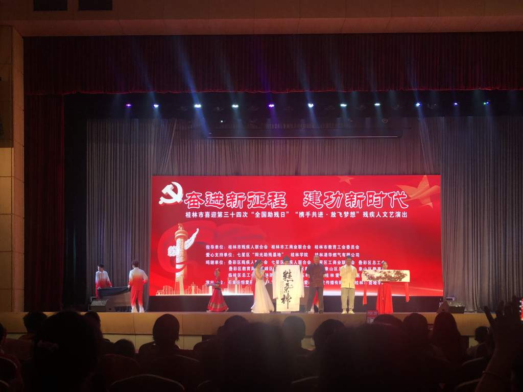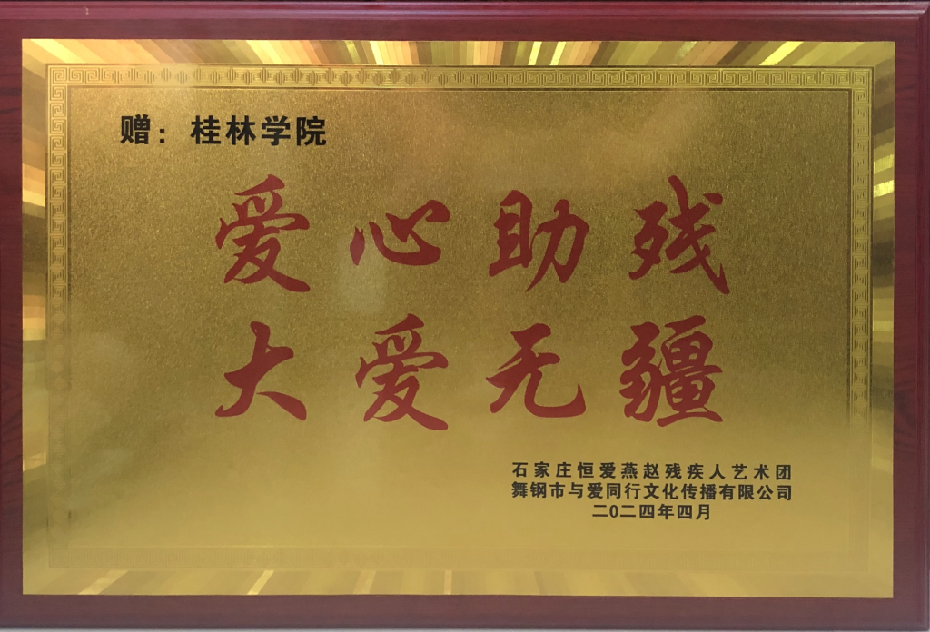 在第34个“全国助残日”即将到来之际,学校助力由桂林市残疾人联合会、桂林市工商业联合会、桂林市教育工会委员会主办的“携手共进•放飞梦想”残疾人文艺晚会,获赠“爱心助残 大爱无疆”爱心牌匾。