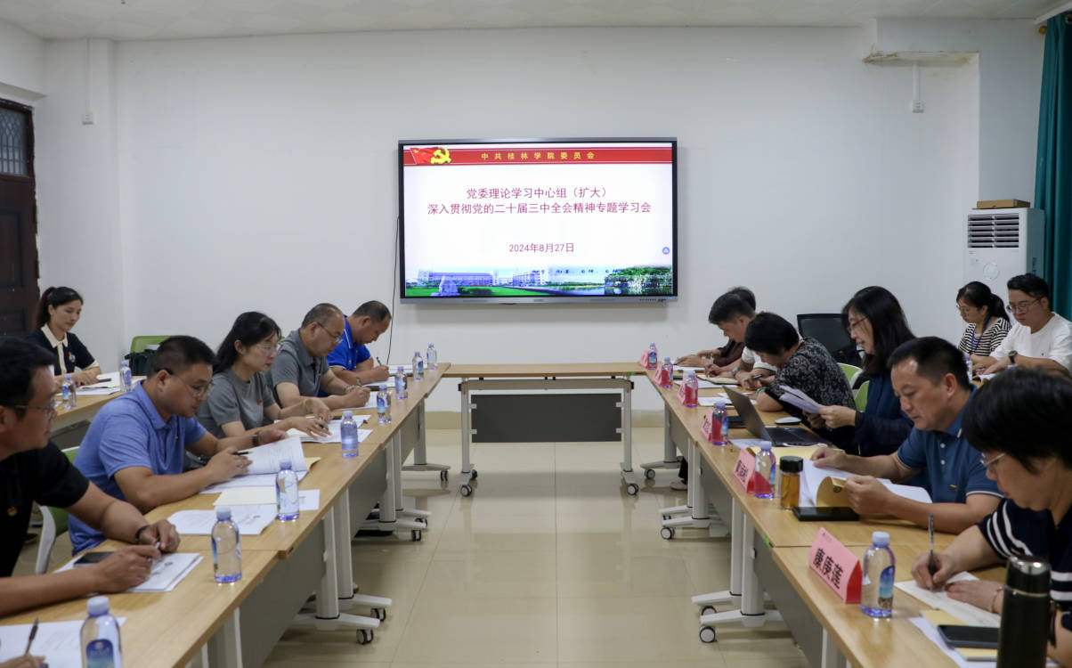 8月26日—27日,学校党委理论学习中心组召开集中学习会,专题学习党的二十届三中全会精神。会议邀请中共广西区委党校、广西行政学院法学教研部主任、教授申华林作专题辅导报告。校党委书记唐文红主持学习并讲话。校党委理论学习中心组全体成员参加学习,非党员校领导、各党总支书记、学校办公室主任、马克思主义学院院长、校团委书记、党委工作部相关人员列席旁听。
