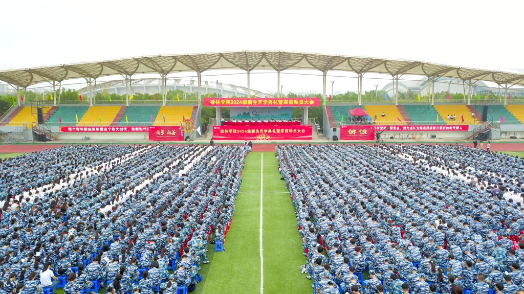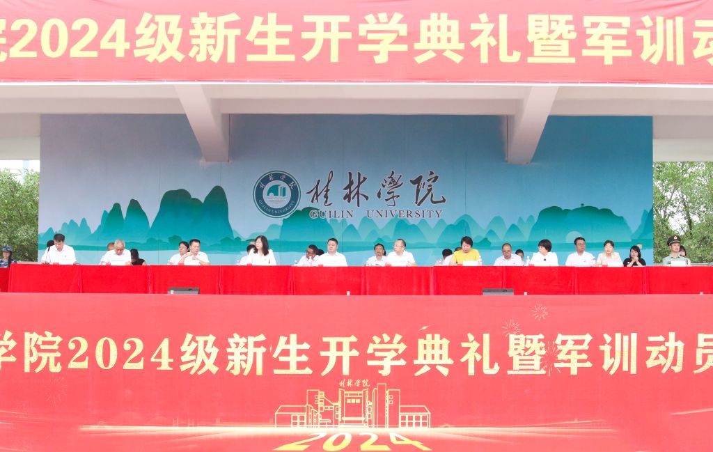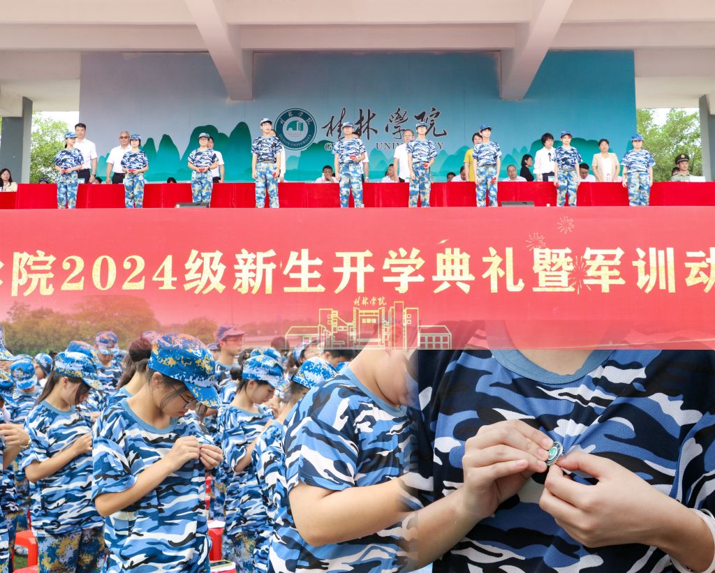 序转秋实,新秀来兮。9月9日上午,学校2024级新生开学典礼暨军训动员大会在田径场隆重举行。3000余名新生齐聚于此,佩戴上桂林学院徽章,接力传承学校“向学、向善,自律、自强”的校训精神,满怀桂院学子的青春热忱与憧憬希望,共同开启人生逐梦的崭新航程。