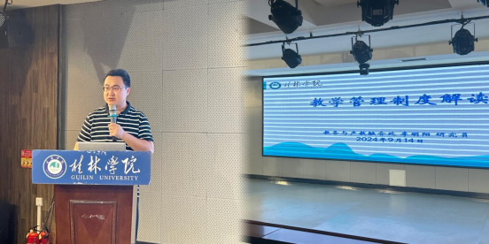 副校长蒋毅以《以党的二十届三中全会精神为指引,全面推进依法治校高质量发展》为主题,结合《中华人民共和国民办教育促进法实施条例》和《桂林学院章程(2022年核准稿)》(以下简称《章程》)主要内容,在依法办学、依法治校、依法治教等方面进行了深度解读。他强调,要深刻领会党的二十届三中全会的重大意义,把握全面深化教育综合改革的战略部署,强化依法治校,加快推进治理体系和治理能力现代化。他指出,《章程》是学校的最高纲领,是学校的根本大法,承载着大学精神,昭示了大学使命,是学校办学理念、办学宗旨、办学目标的集中体现,是学校实现依法治校的重要依据和法律基础。在报告中,蒋毅副校长还回顾了学校从初创到转设的发展历程,介绍了学校未来总体发展目标和思路,勉励新教师们要持续加强学习、追求卓越,主动将个人职业发展融入到学校教育事业的发展之中,为桂林学院教育事业的高质量发展贡献力量。