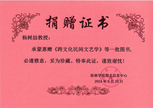 近日,广西师范大学中国语言文学学科教授、我校原校长杨树喆博士向校图书馆捐赠了一批个人珍藏图书。这是他继2020年和2022年两次捐赠个人学术著作之后的第三次捐赠,共100余册,价值万余元,内容涉及文学、教育、历史文化等领域,具有较高的收藏和利用价值。学校图文信息中心负责人代表图书馆接受了赠书,同时向杨树喆颁发了捐赠证书。目前,图书馆已完成捐赠图书的分编录入、上架,供广大师生借阅。