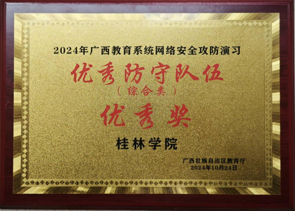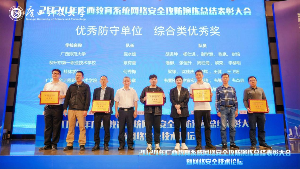 10月25日,2024年广西教育系统网络安全攻防演习总结会暨网络安全技术论坛在柳州市举行,本次活动由自治区教育厅主办,广西教育系统网络安全监测中心(广西科技大学)承办。自治区教育厅教育信息化管理处处长魏莹莹出席会议并讲话。会议通报了本次攻防演习总体情况并对获奖单位进行表彰。我校在此次演习中表现优异,荣获了防守单位“综合类”优秀奖。