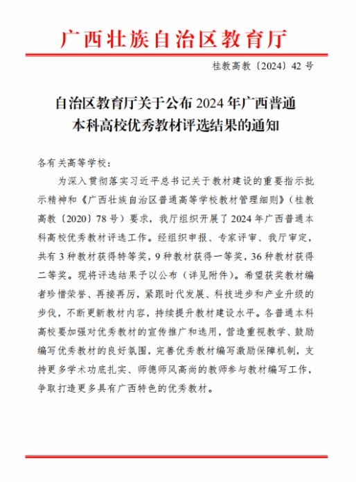 近日,自治区教育厅下发通知《自治区教育厅关于公布2024年广西普通本科高校优秀教材评选结果的通知》,作为全区教材建设领域的最高奖项,本次评选共评出特等奖3部、一等奖9部、二等奖36部;由我校前任院(校)长蔡昌卓教授担任总主编、何玲教授任主编、大学英语教学团队参编的《新思路大学英语视听说教程》荣获特等奖!该套教材同时获评“十四五”普通高等教育本科国家级规划教材评选资格!