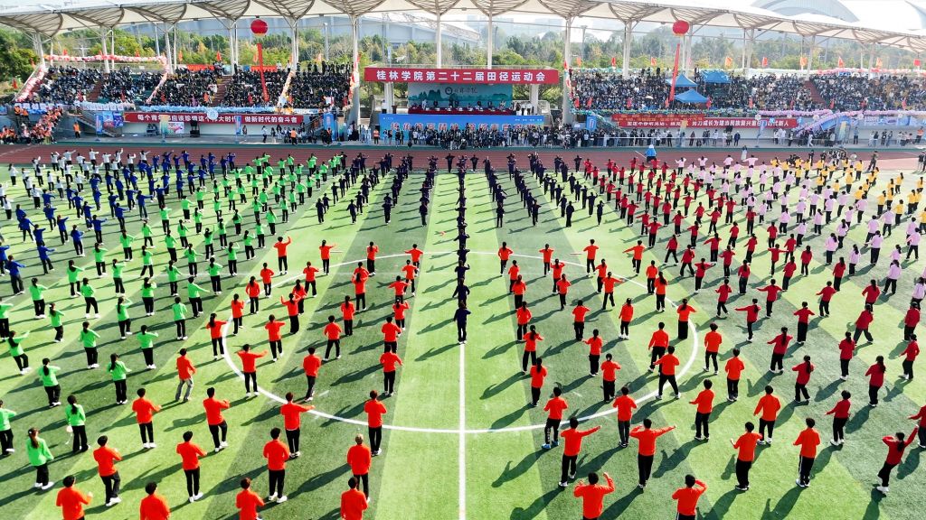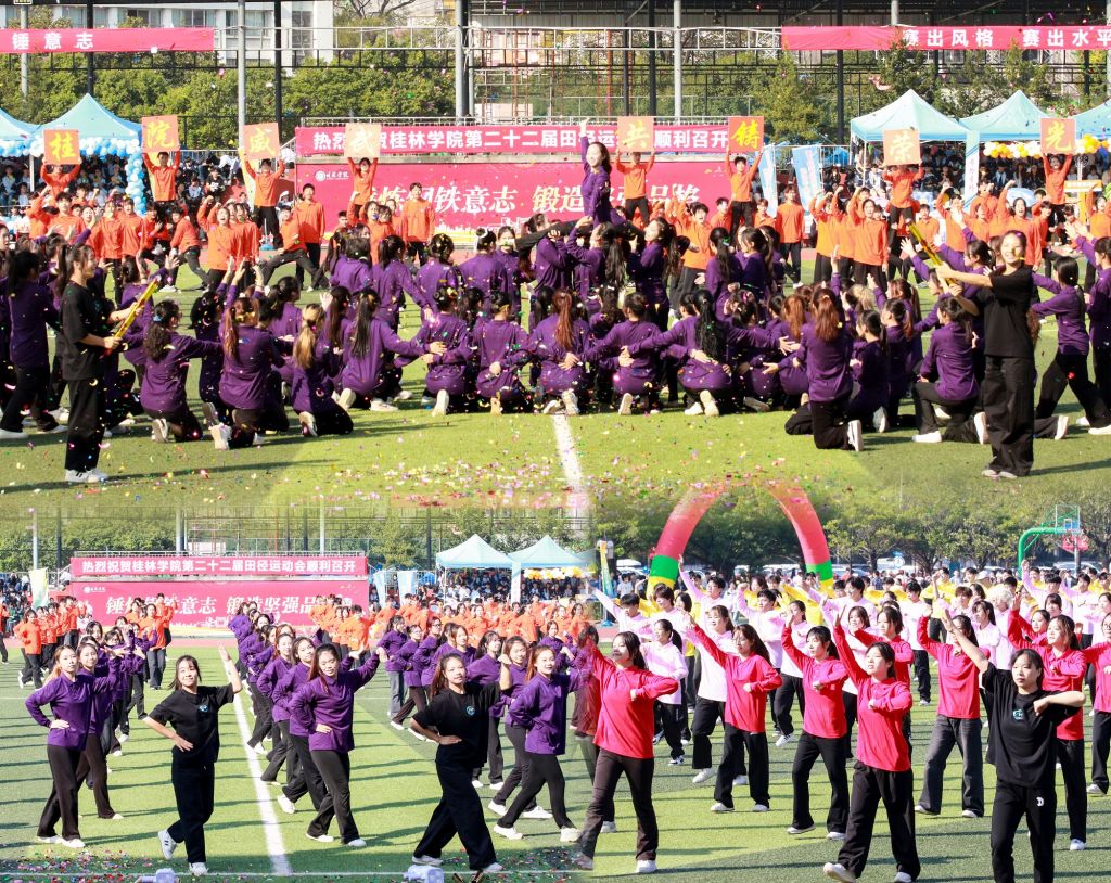 开幕式现场,学校国旗护卫队,裁判员方队,志愿者方队,各二级学院、各单位方队精神抖擞,在激昂的运动员进行曲中依次亮相,展现了桂院人昂扬向上的精神面貌。各方阵结合单位和专业特色,奉献了一个个别出心裁的创意方队表演,表达了桂院师生不负时代重托、奋力书写为中国式现代化挺膺担当桂院篇章的赤子之情。大型青春舞团体操表演将开幕式推向了高潮,同学们精神饱满、动作整齐、舞姿轻快、笑容自信,处处洋溢着青春的风采。
