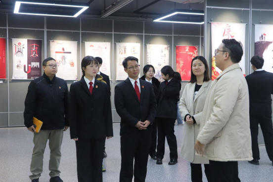 在学校嘉善楼一楼展厅,师生们参观了城市设计学院师生主创的“党史中的廉洁之光”主题海报作品展。此次展览以庆祝新中国成立75周年暨清廉学校建设为主题,通过海报作品展示了中国共产党在反腐倡廉方面的光辉历程和显著成就。海报内容涵盖党风廉政建设、反腐败斗争以及新时代清廉文化等多个方面,生动再现了中国共产党人廉洁奉公、勤政为民的崇高精神。金融与法律学院党总支书记向现场师生做详细解说,与会人员进行了深入的交流,共同探讨了清廉文化的传承与创新。现场法官与师生们边走边看,边思边议,深刻感受到了廉洁文化在党史中的重要地位和积极作用。