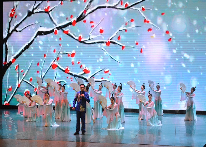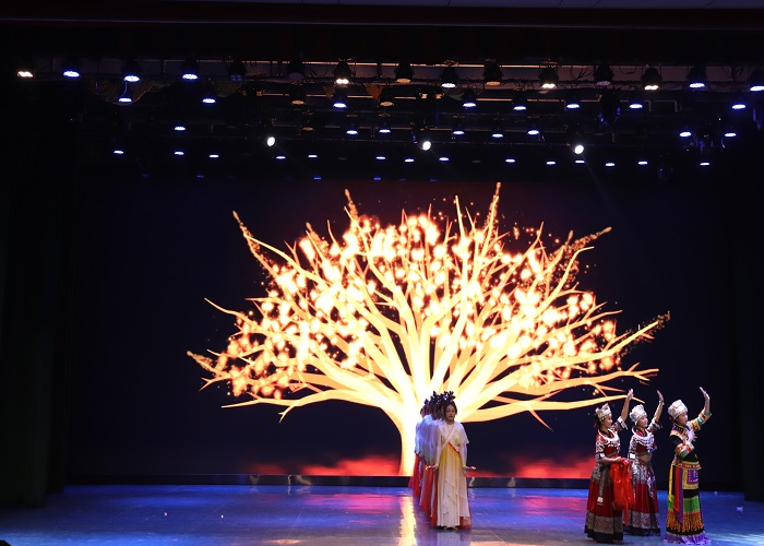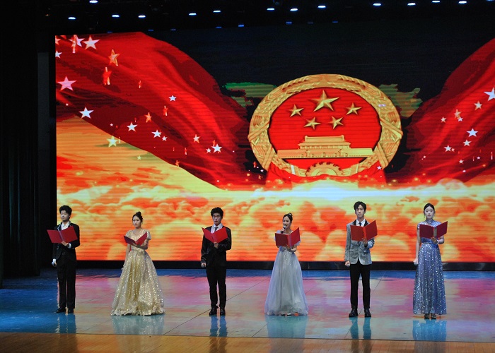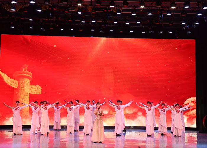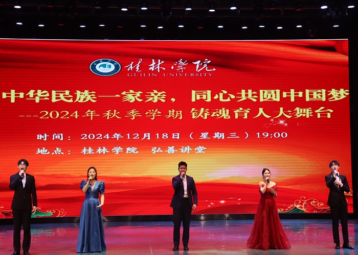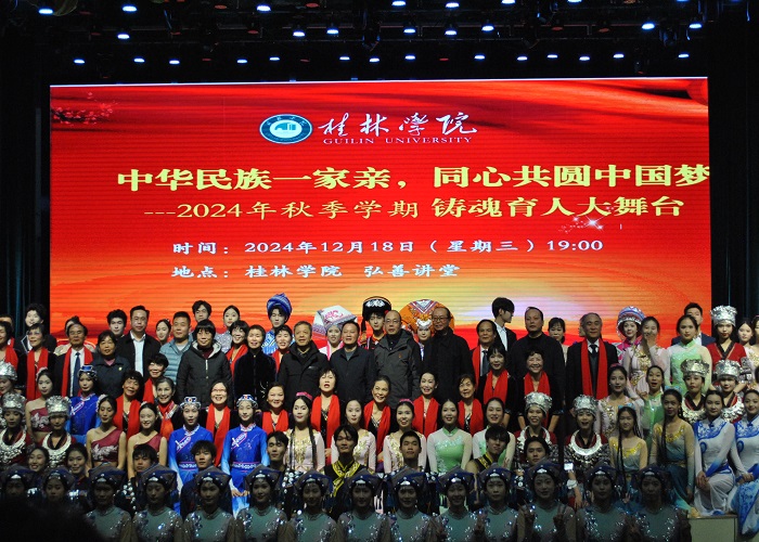 为庆祝中华人民共和国成立75周年,铸牢中华民族共同体意识,弘扬爱国主义精神, 12月18日晚,我校在弘善讲堂隆重举行“中华民族一家亲,同心共圆中国梦——2024年秋季学期铸魂育人大舞台”专场演出,为现场师生展开了一场以民族团结教育为主题的思政大课。学校党委副书记黄润松、纪委书记康庚莲、副校长何玲和相关部门、各学院负责人共500余名师生观看演出。